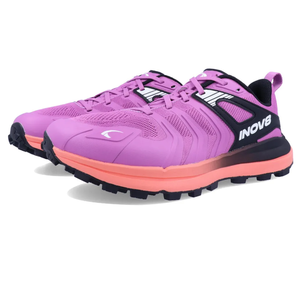 Die Zwischensohle besteht aus Inov8s superkritischem, stickstoffangereichertem FLYSPEED PRO-Schaumstoff. Dieser widerstandsfähige Schaumstoff sorgt für hervorragende Dämpfung, Bodengefühl und Stabilität auf unebenem Gelände. Das ist ideal, wenn über lange Distanzen dauerhafter Komfort und Halt gefragt ist. Die stickstoffangereicherte Zwischensohle ist leicht und federnd, verbessert die Energierückgabe und Reaktionsfreudigkeit und unterstützt bei jedem Schritt – für mehr Geschwindigkeit und Ausdauer. Gleichzeitig absorbiert sie Stöße und Aufprallkräfte auf harten Untergründen, was die Gelenke entlastet und das Verletzungsrisiko reduziert. Ergänzt wird die Zwischensohle durch das BOOMERANG-Fußbett, das aus Hunderten expandierter TPU-Perlen besteht, die sich beim Auftreten komprimieren und zurückfedern – für eine Energierückgabe von 40 %, die zu längerer Leistungsfähigkeit beiträgt. Abgerundet wird die Zwischensohle durch eine flexible META-PLATE-Steinschutzplatte, die vor Steinen und Wurzeln schützt.